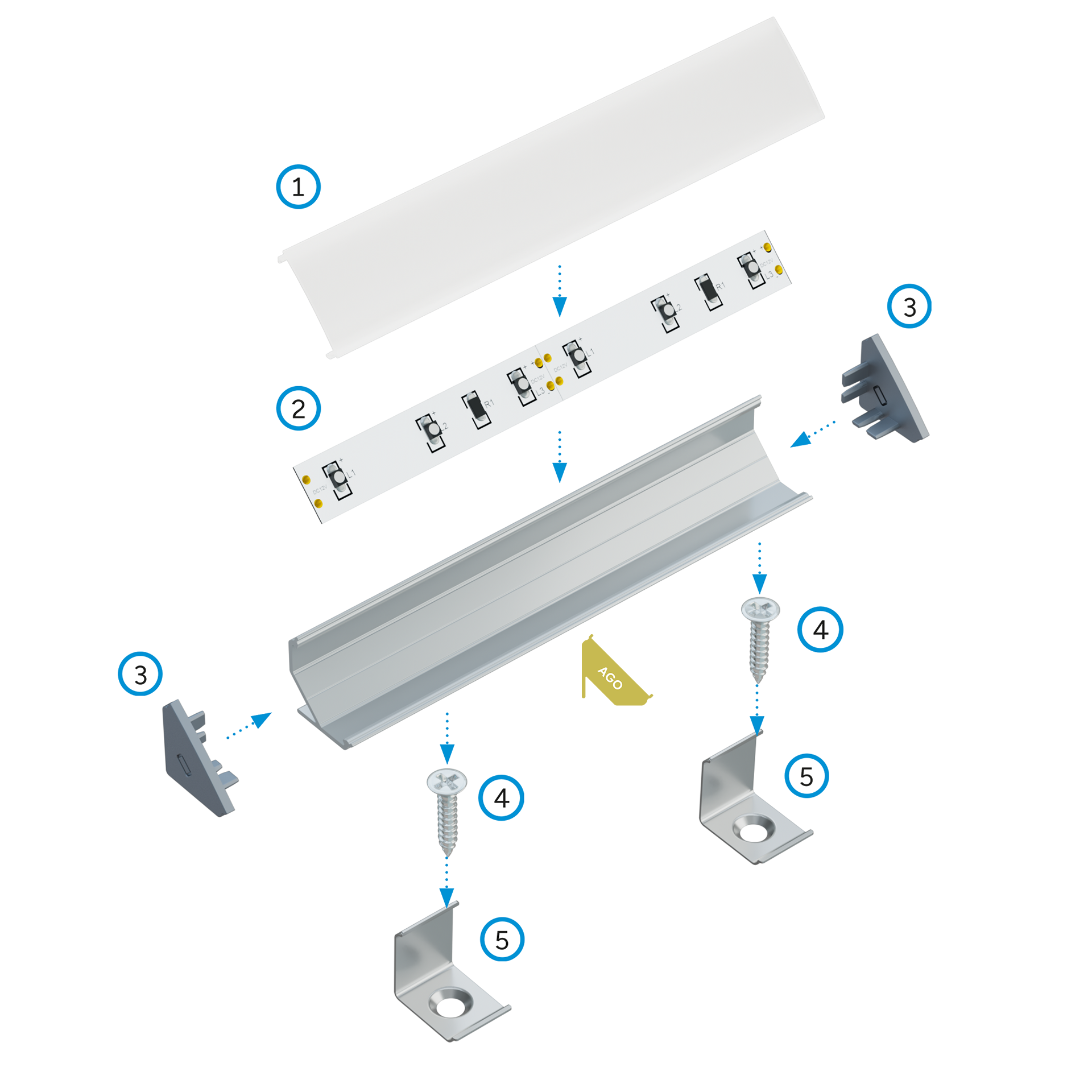 Assembly scheme for elements of the Lighting system using profile AGO and (1) COMPACT cover, (2) LED strip, (3) end caps, (4) screws, (5) mounting clips.