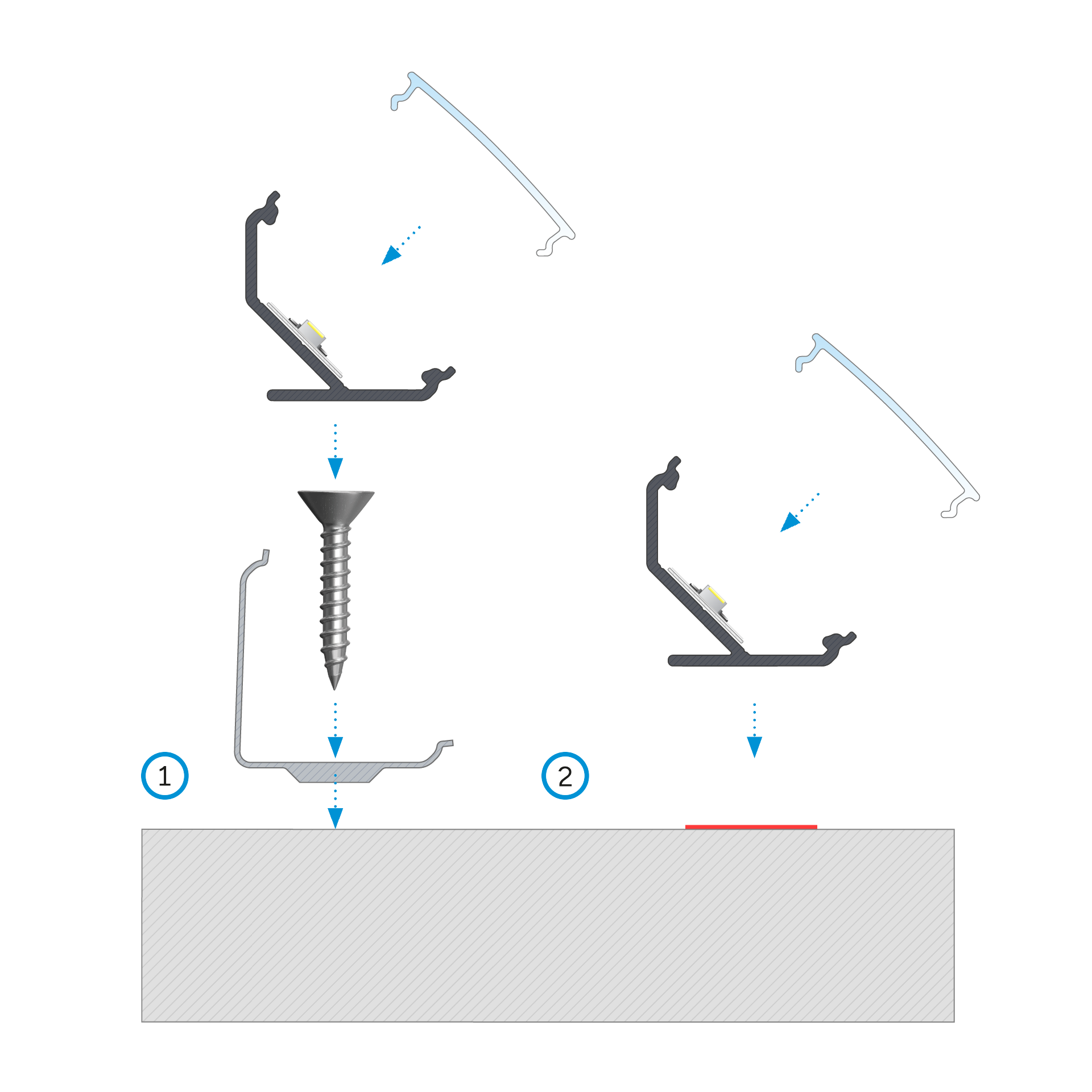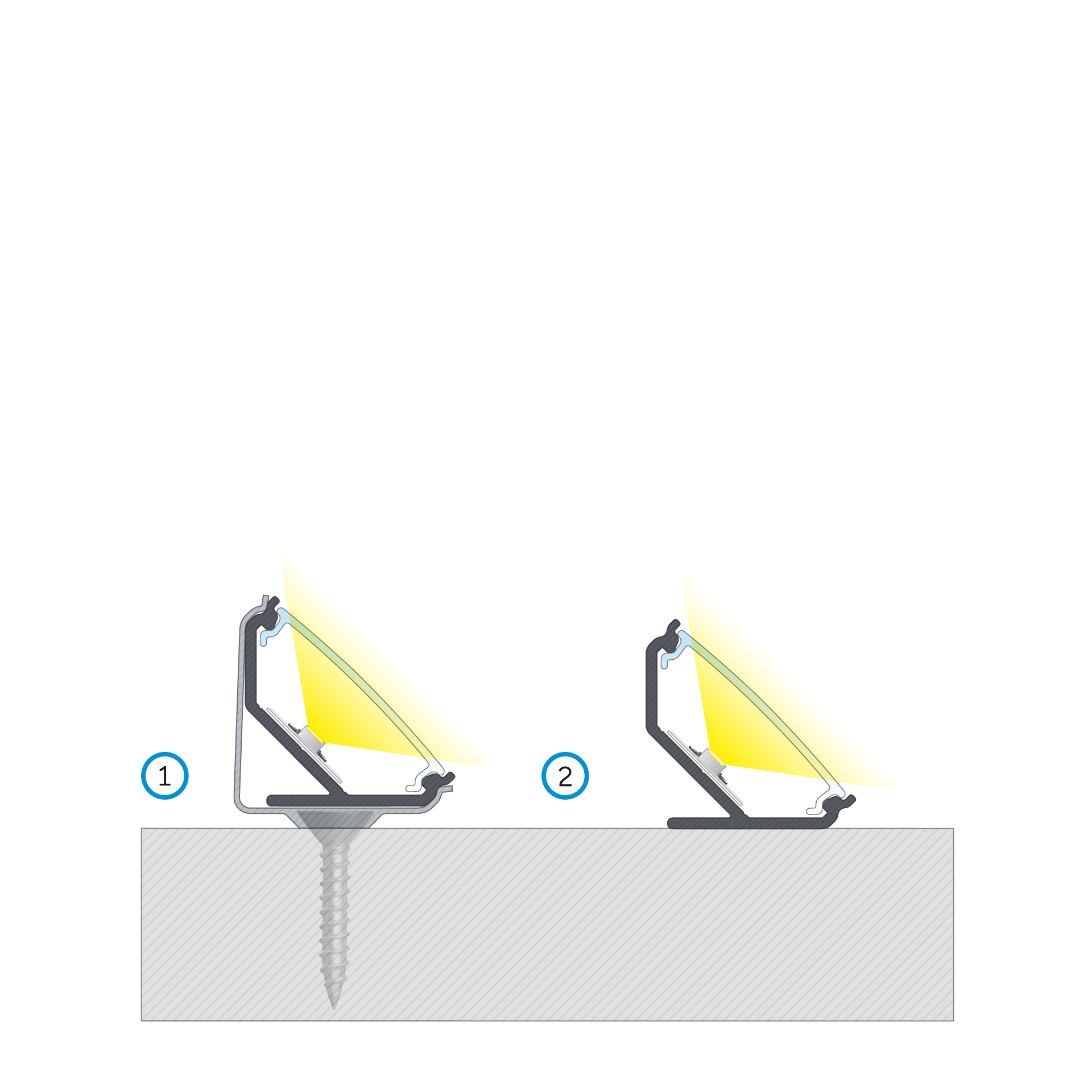Final result of installing the angled AGO profile with a COMPACT cover using (1) a mounting clip, (2) double-sided tape.
