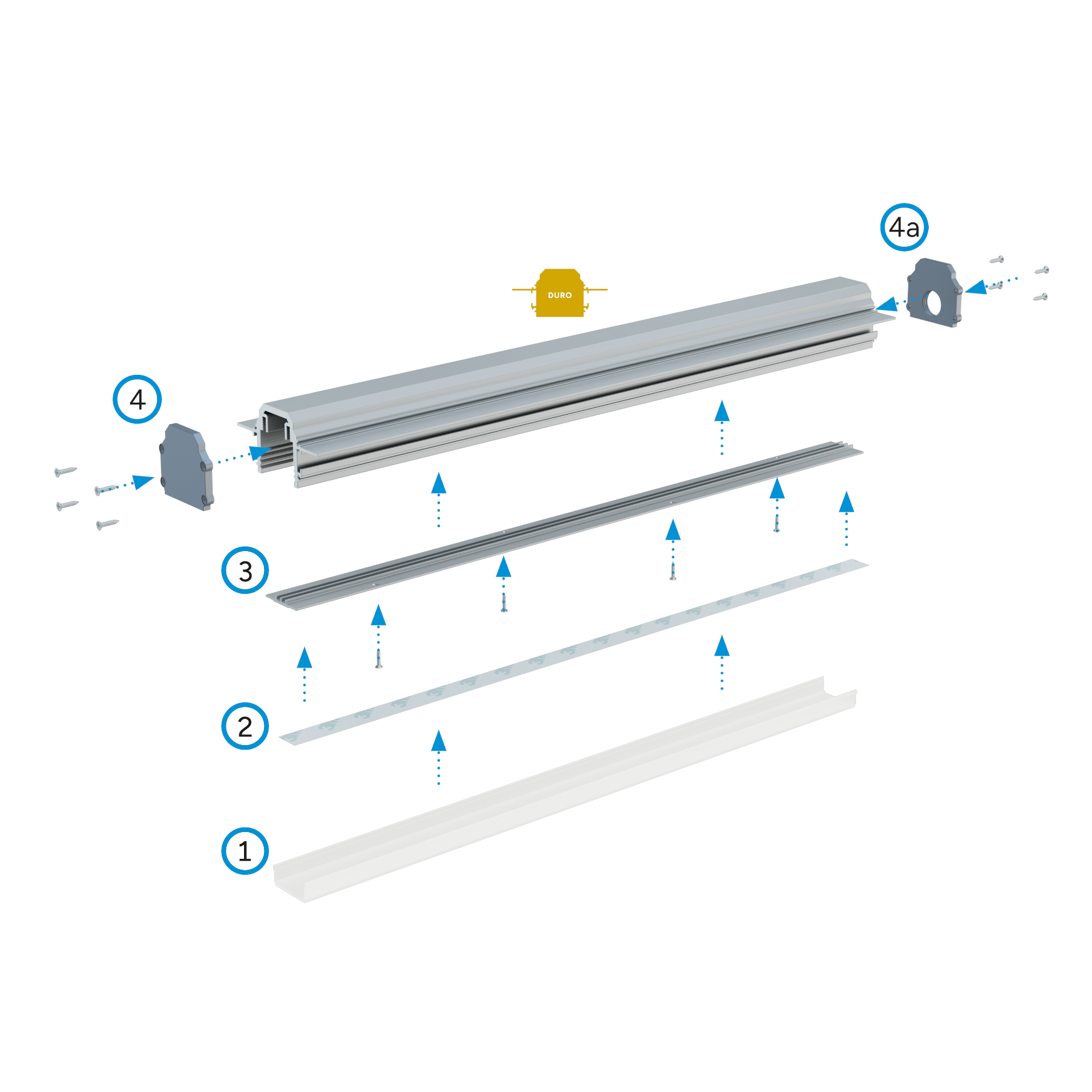 Assembly scheme for elements of the lighting system using the DURO profile and (1) LIFT ONE cover, (2) LED strip, (3) DURO M1 mounting profile, (4) DURO end cap without hole, (4a) DURO end cap with hole.