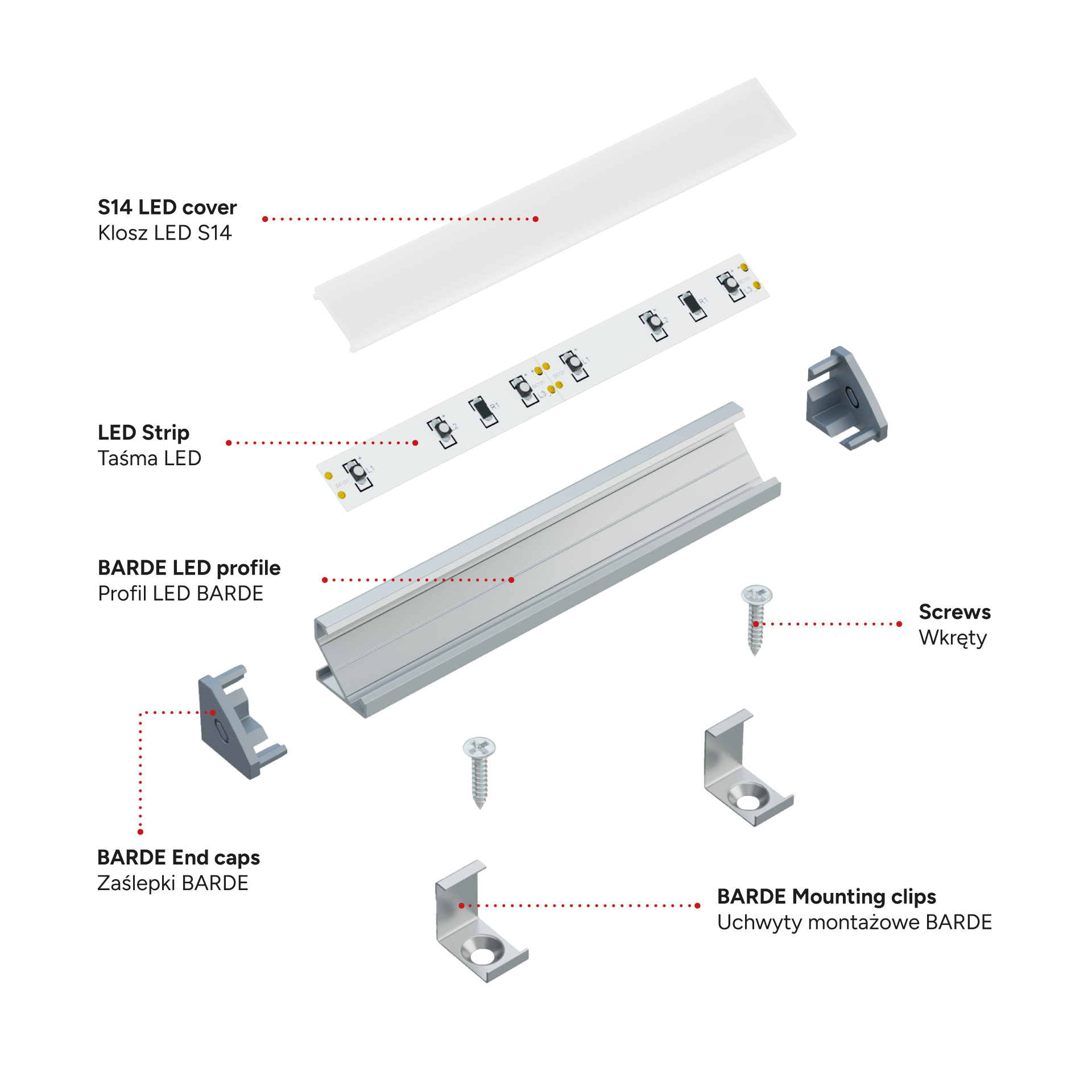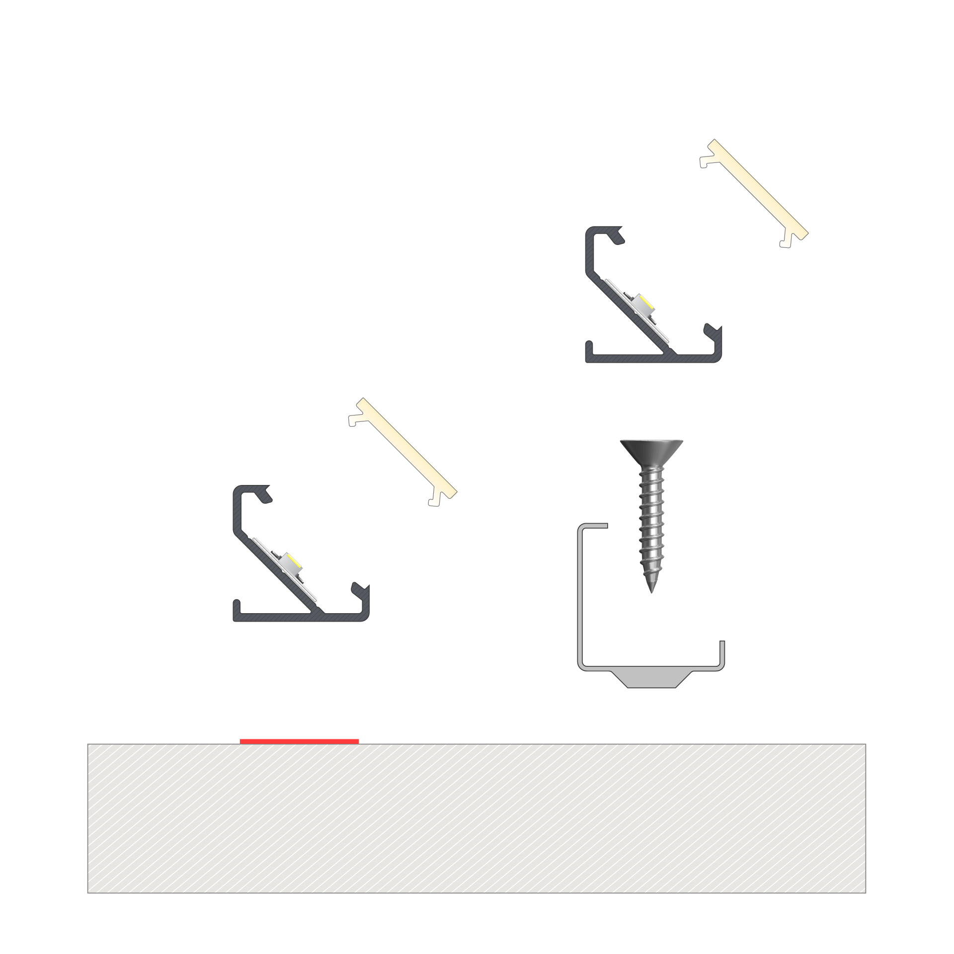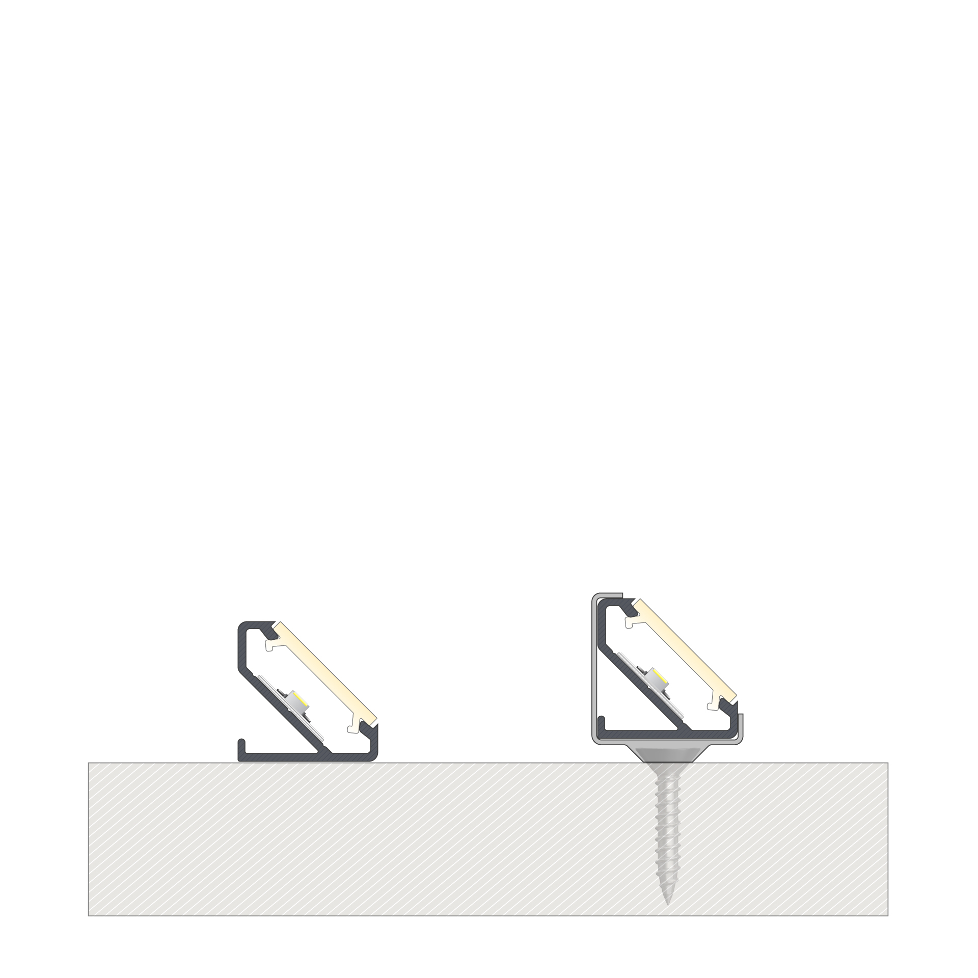 45° angle LED profile for use in kitchens and display areas. Used to illuminate cabinets, countertops and other work surfaces.