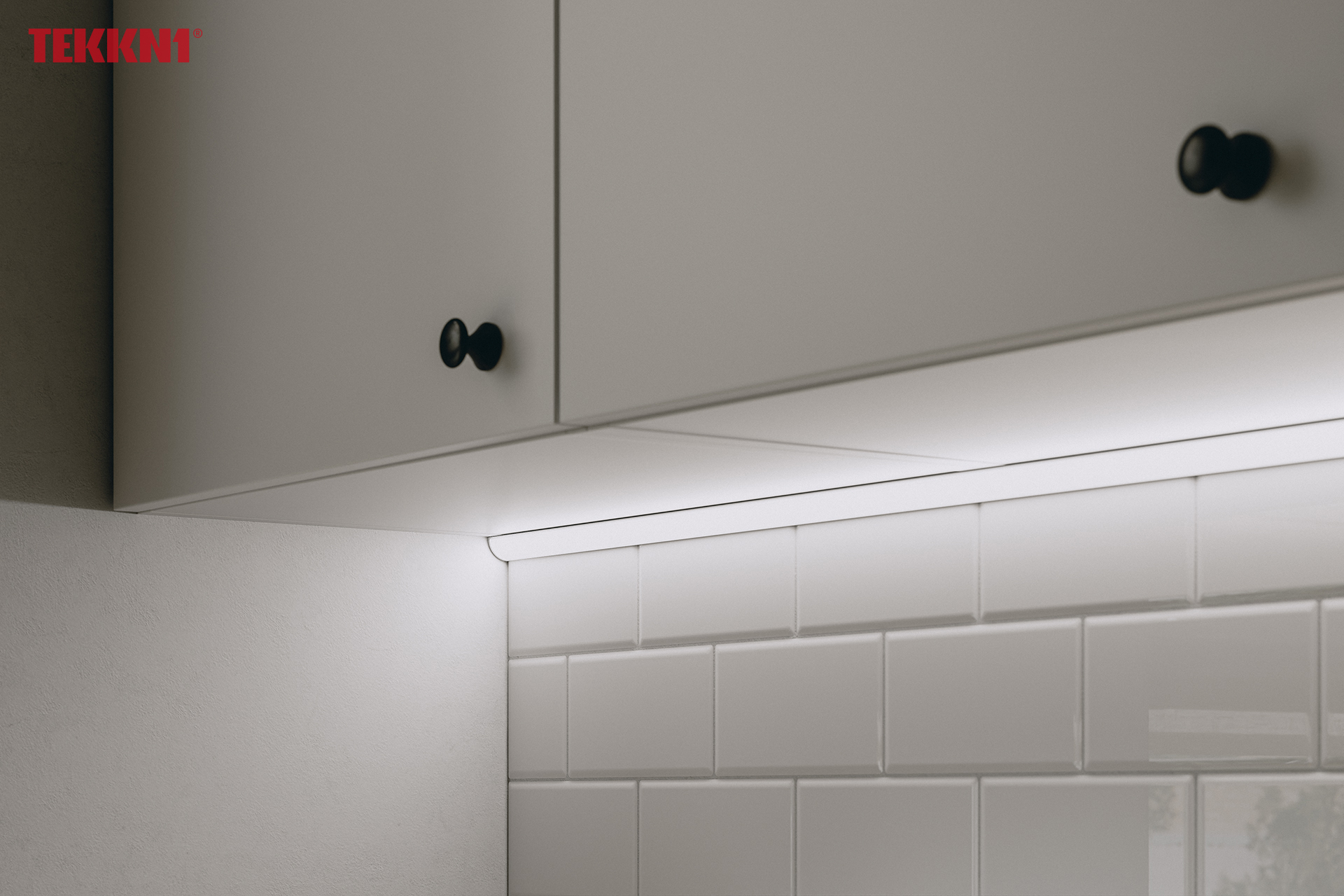 45° angle LED profile for use in kitchens and display areas. Used to illuminate cabinets, countertops and other work surfaces.