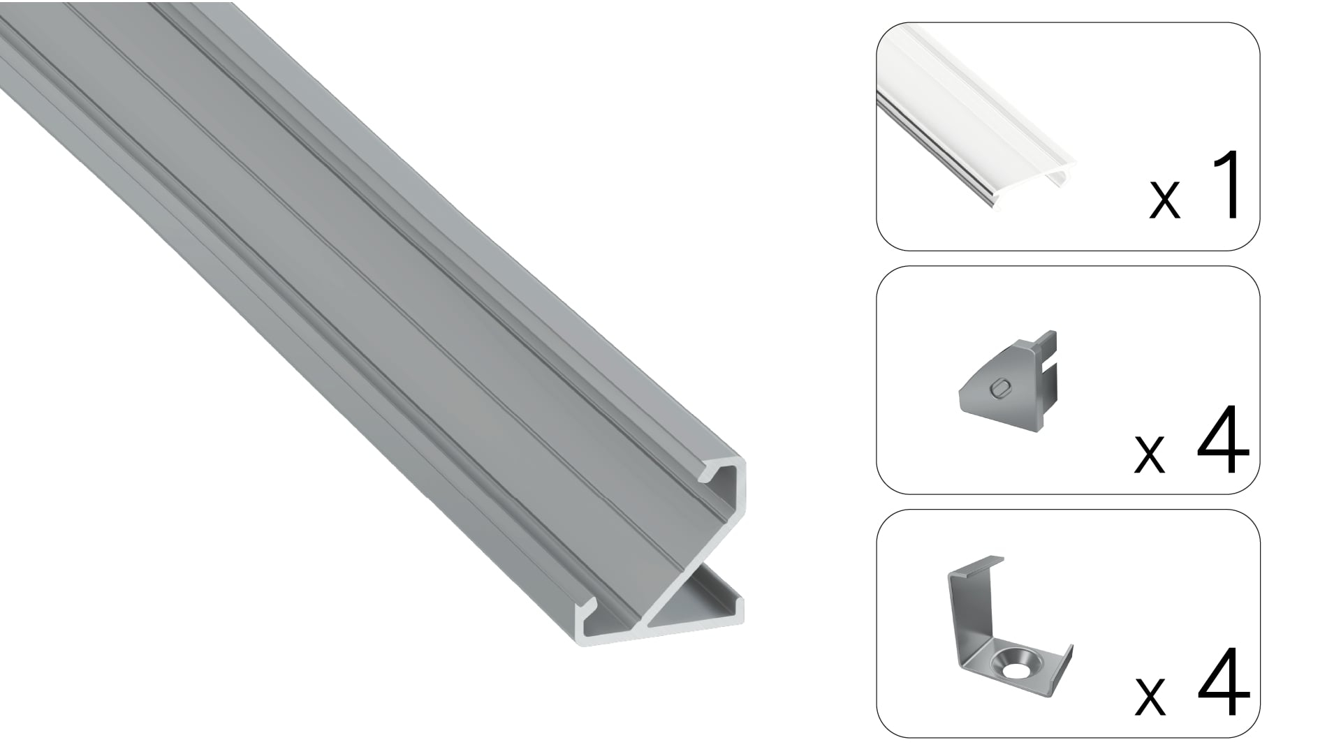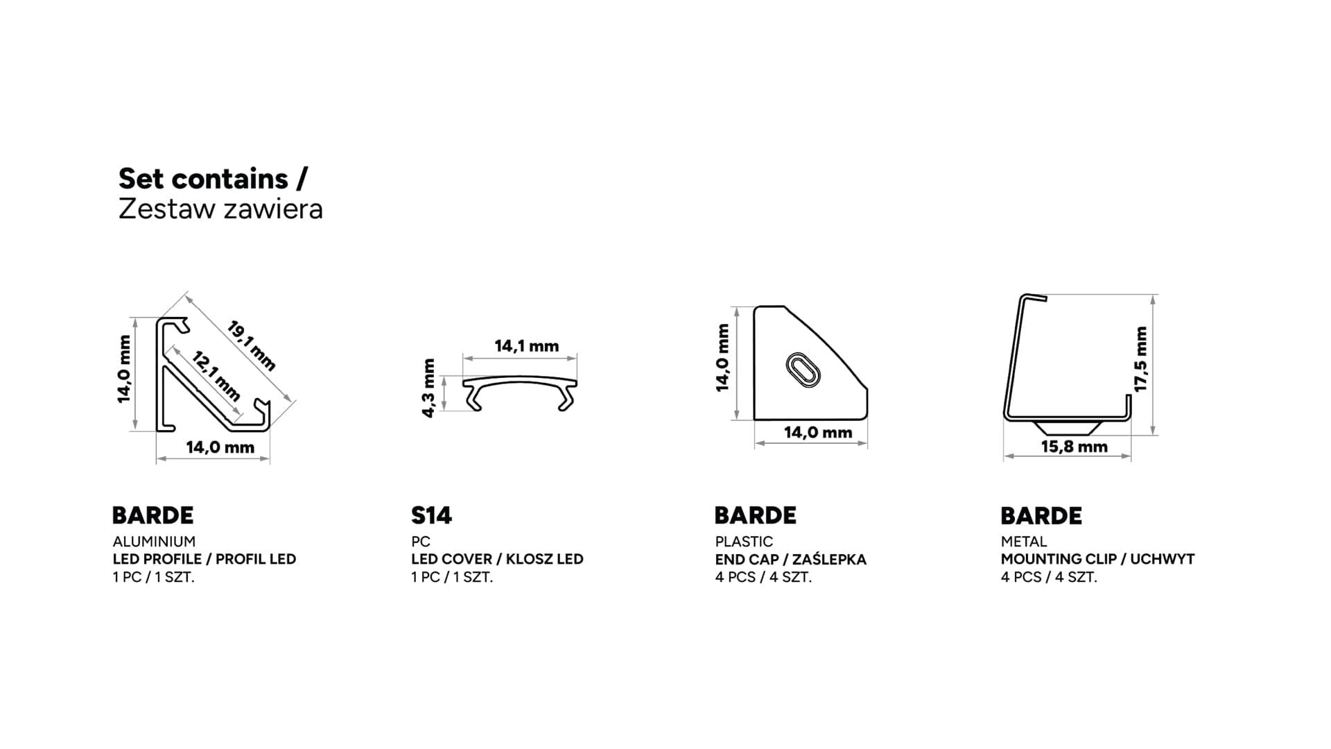 Set contains: 1 x BARDE LED profile, 1 x S14 LED cover, 4 x BARDE End cap, 4 x BARDE Mounting clip