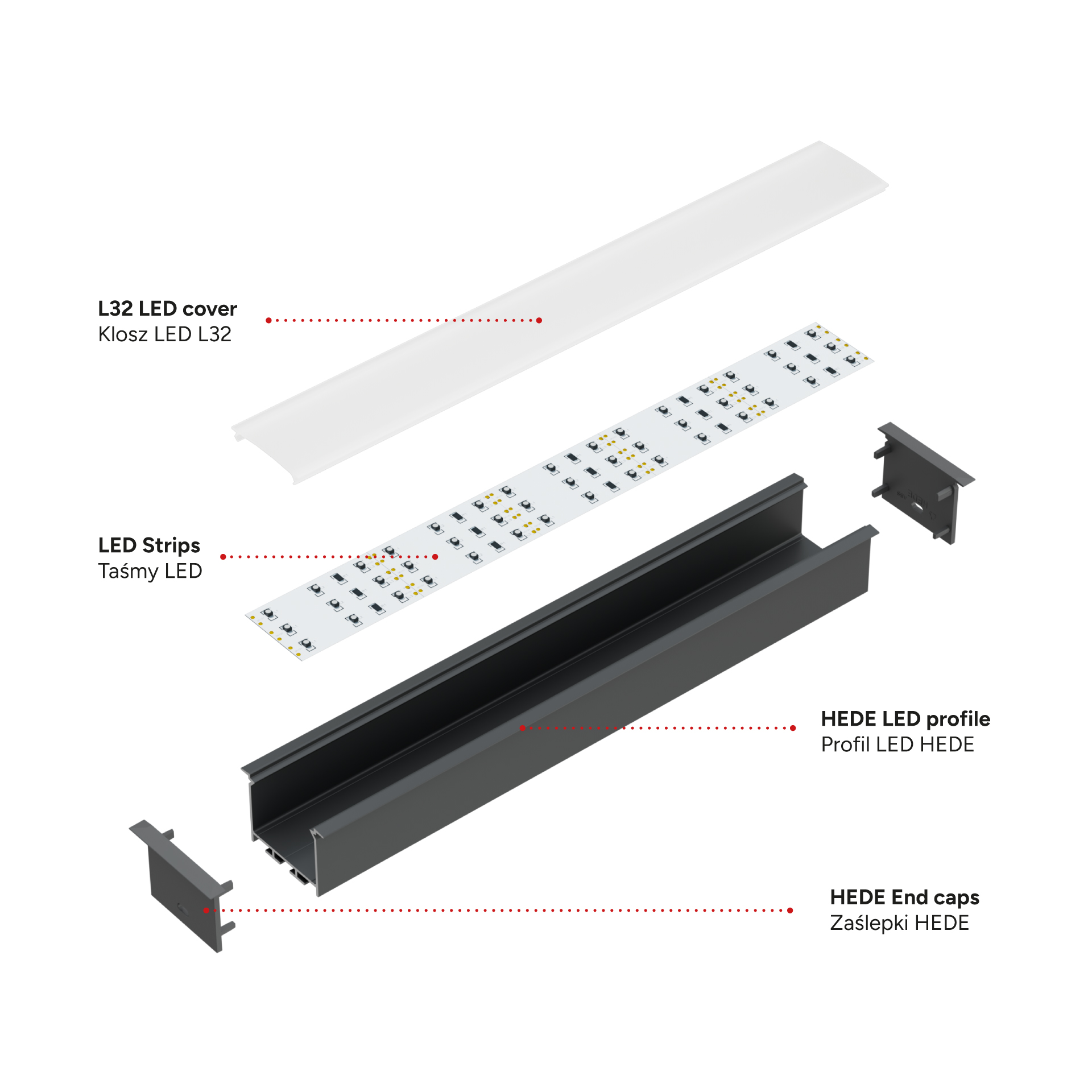 Set contains: 1 x HEDE LED profile, 1 x L32 LED cover, 4 x HEDE End cap