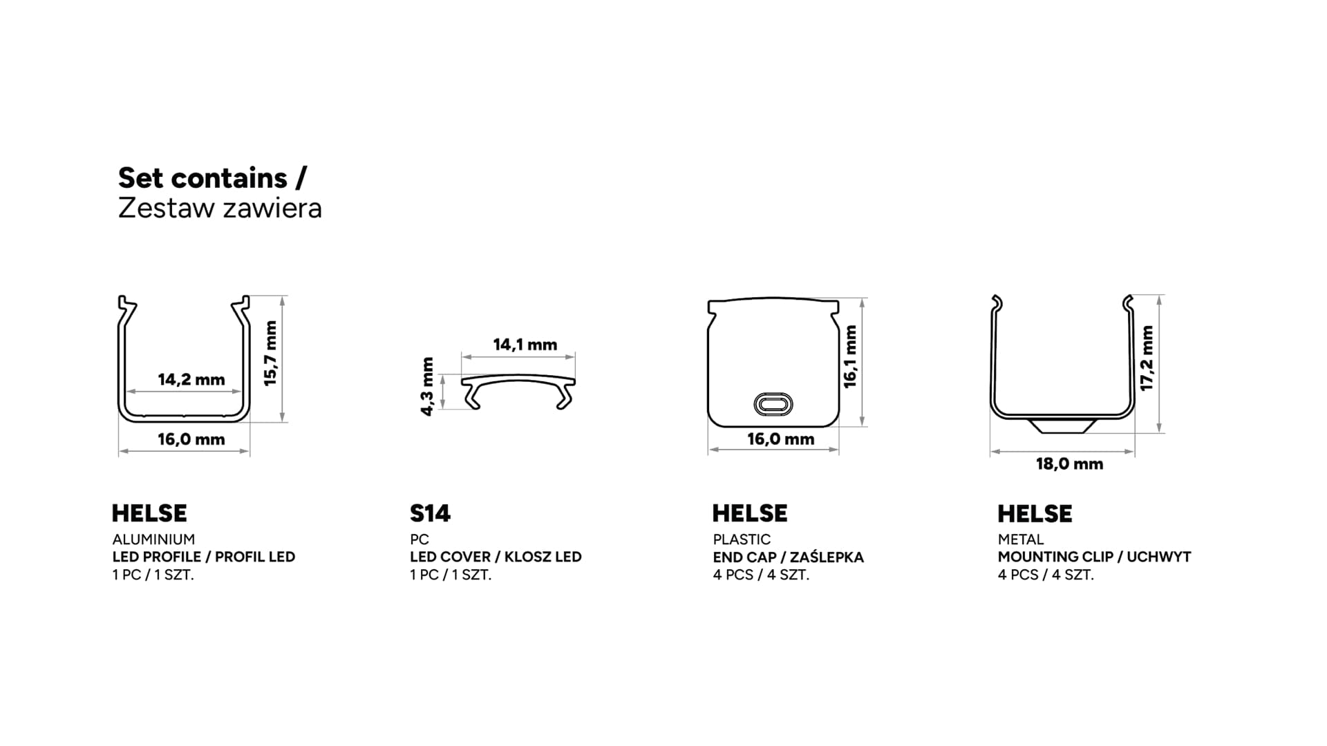 Set contains: 1 x HELSE LED profile, 1 x S14 LED cover, 4 x HELSE End cap, 4 x HELSE Mounting clip