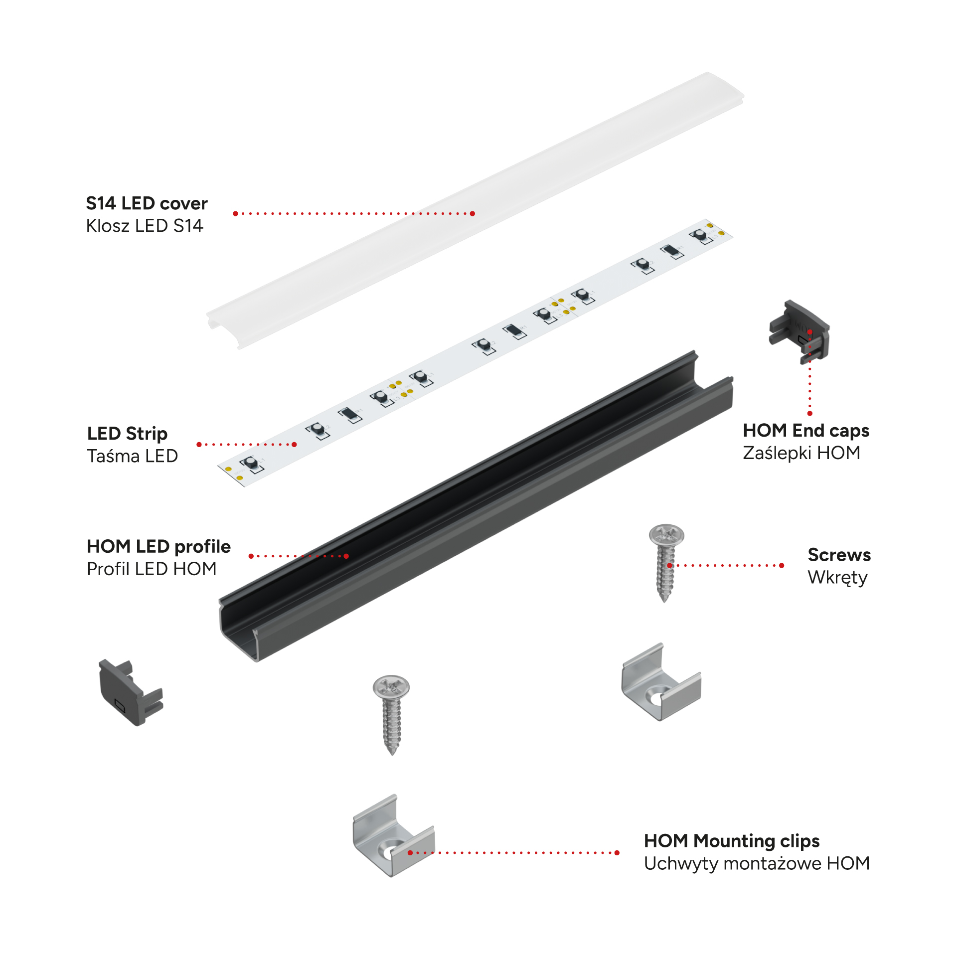 Set contains: 1 x HOM LED profile, 1 x S14 LED cover, 4 x HOM End cap, 4 x HOM Mounting clip