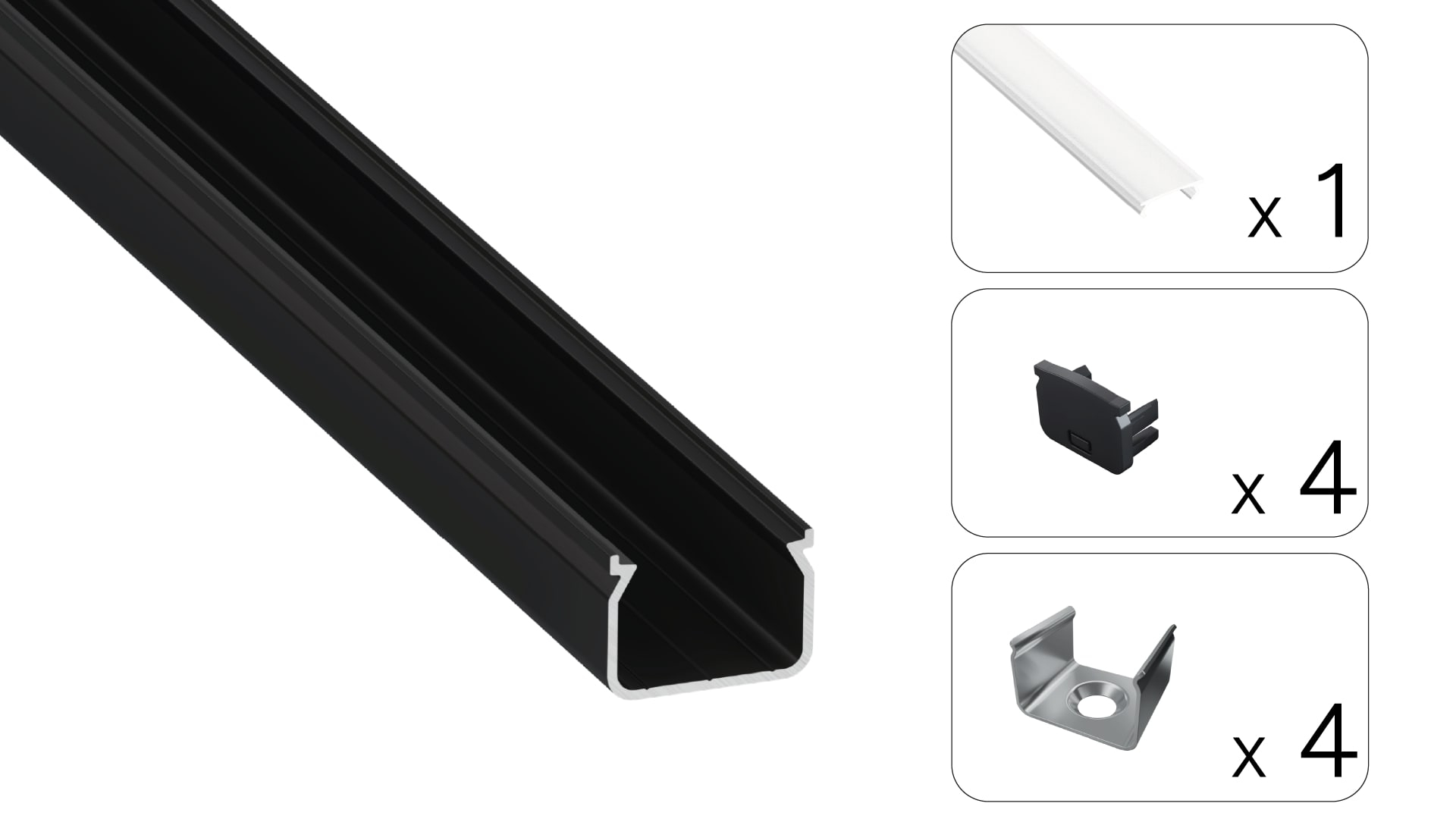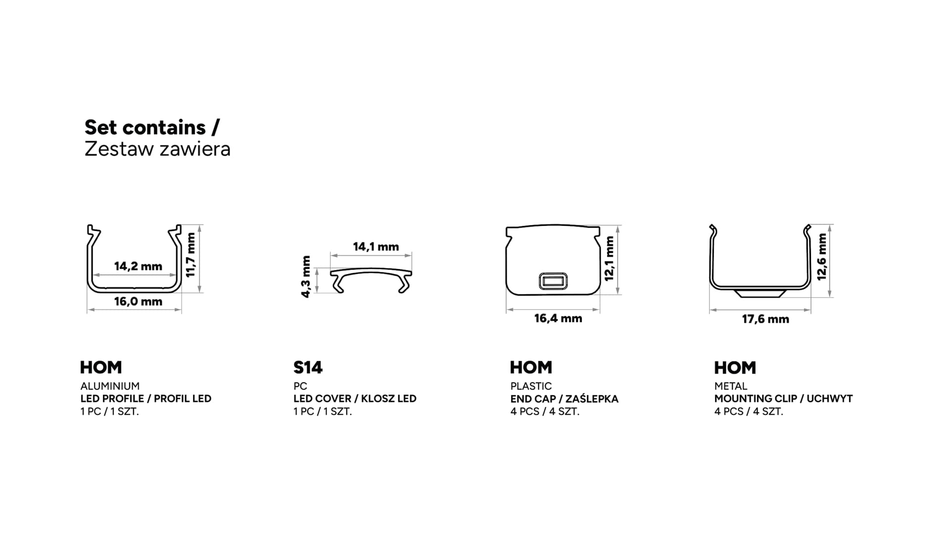 Set contains: 1 x HOM LED profile, 1 x S14 LED cover, 4 x HOM End cap, 4 x HOM Mounting clip