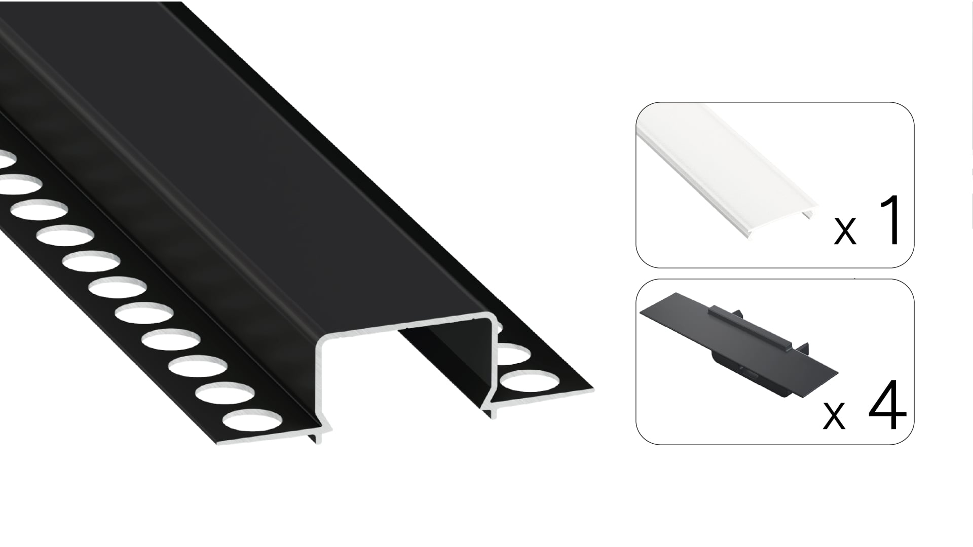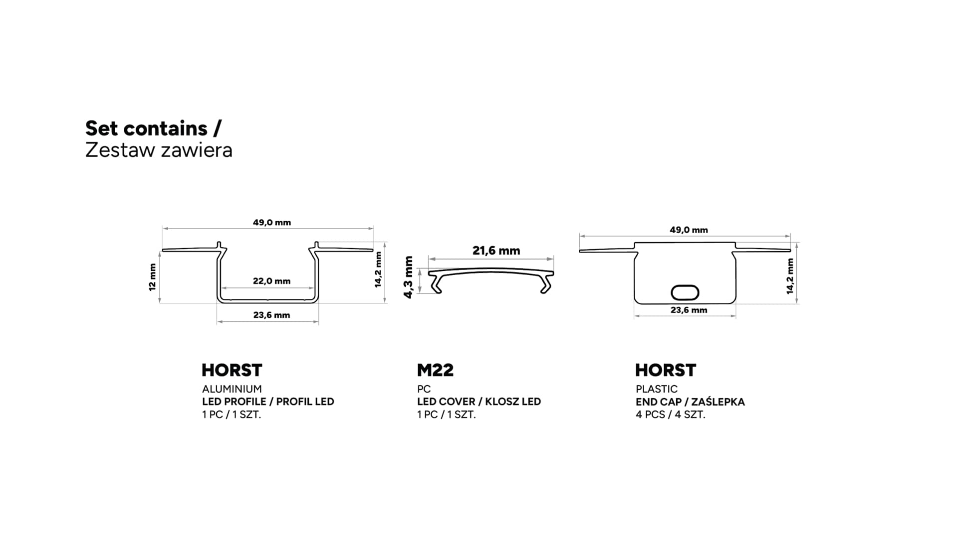 Set contains: 1 x HORST LED profile, 1 x M22 LED cover, 4 x HORST End cap