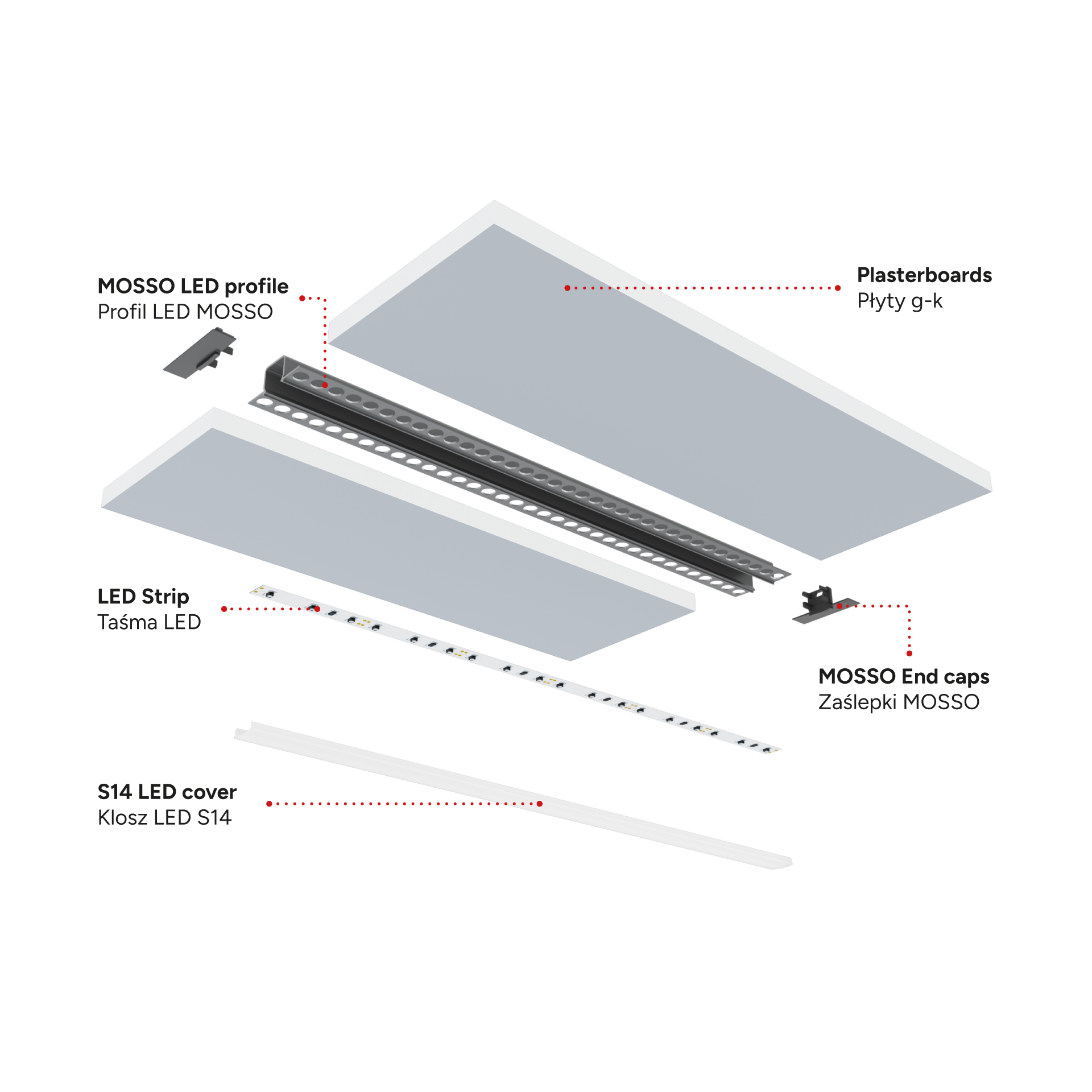 Set contains: 1 x MOSSO LED profile, 1 x S14 LED cover, 4 x MOSSO End cap