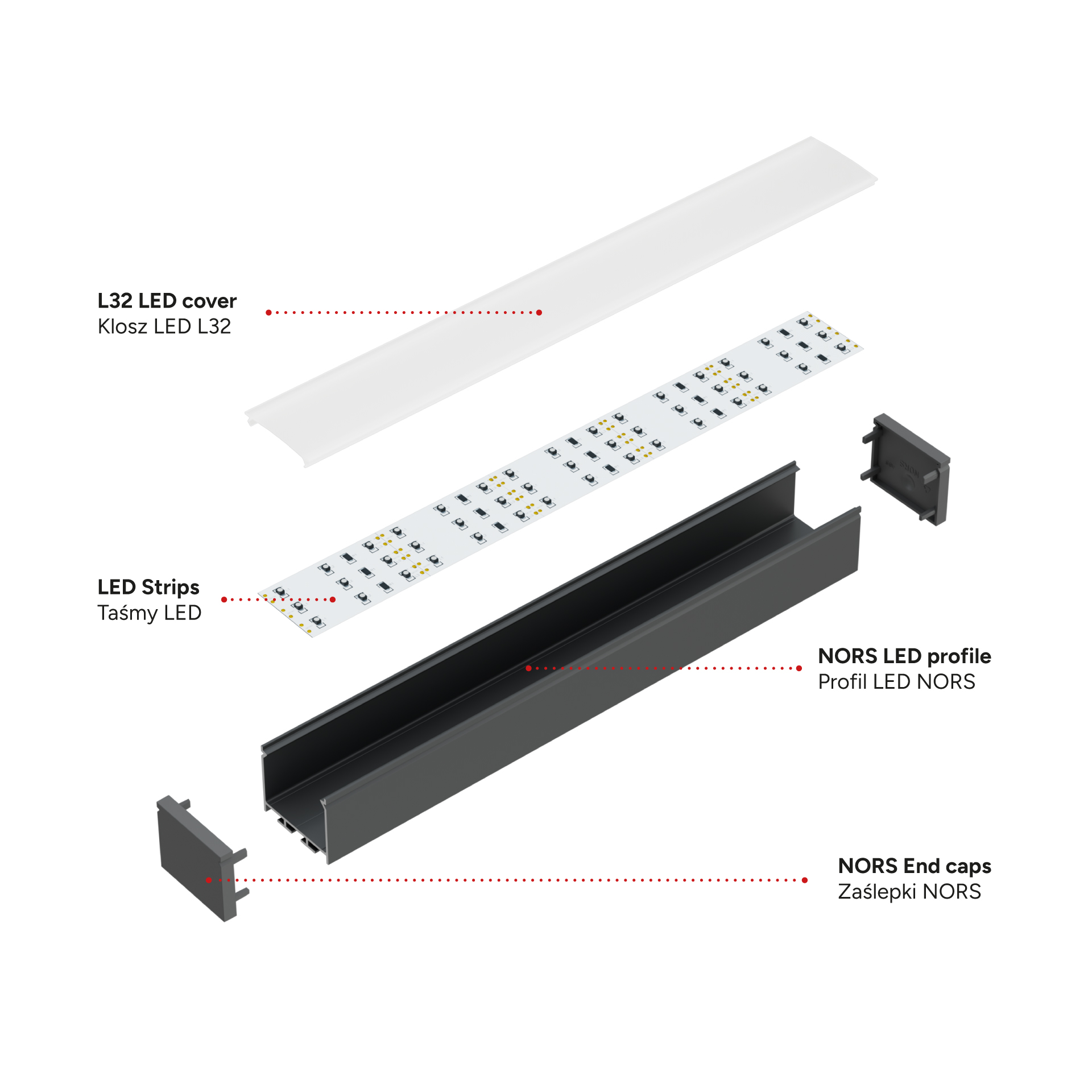 Set contains: 1 x NORS LED profile, 1 x L32 LED cover, 4 x NORS End cap