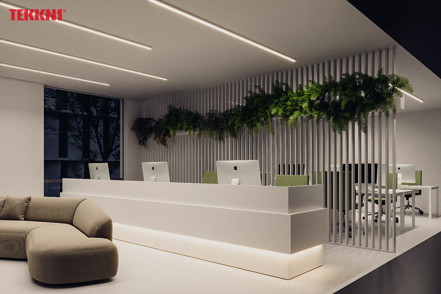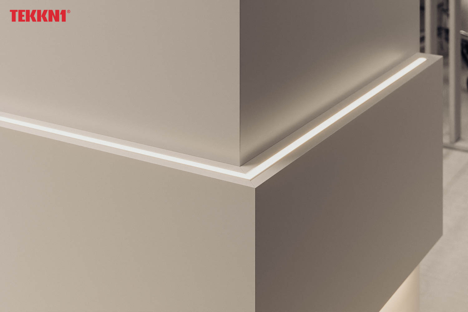 Recessed LED profile for use in kitchens and display areas. Used to illuminate cabinets, countertops, and other work surfaces.